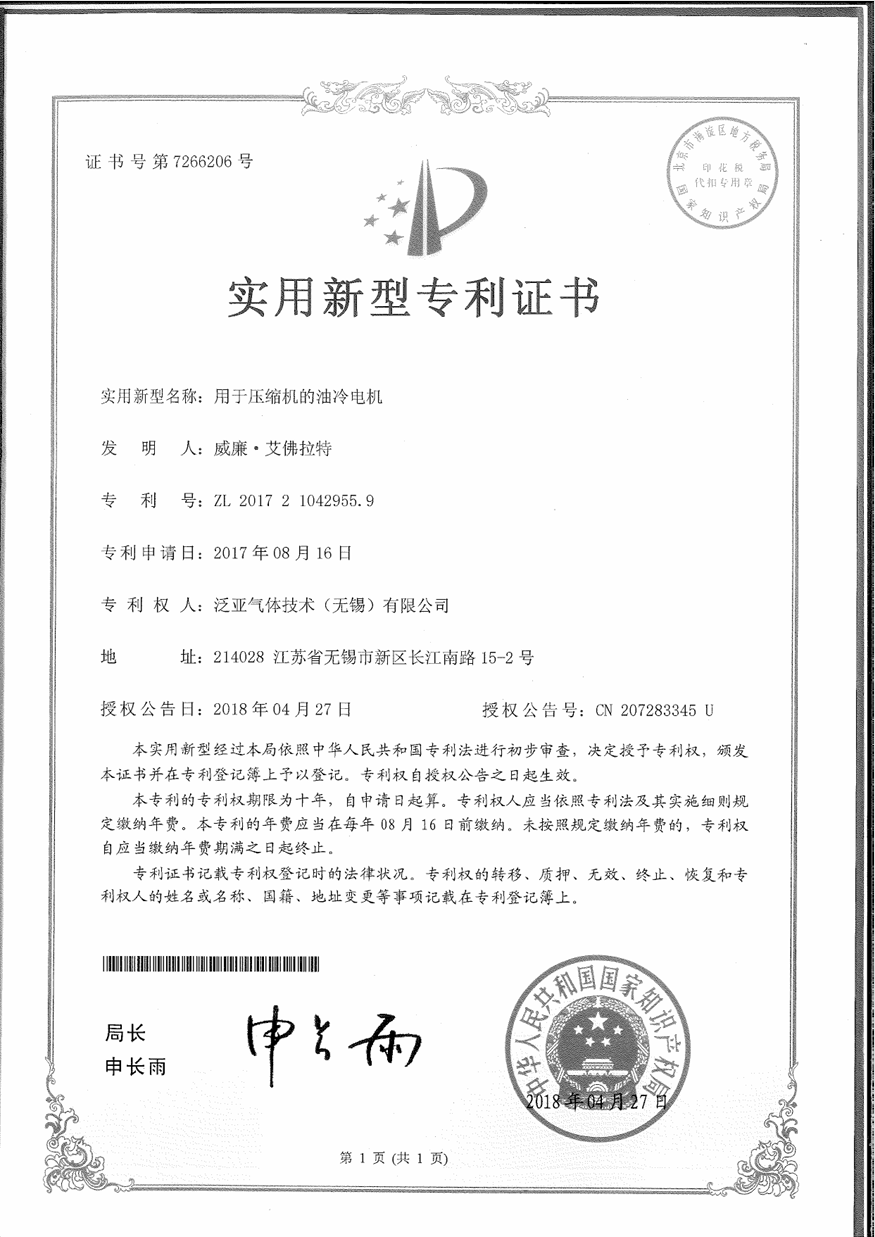 用于压缩机的油冷电机专利证书