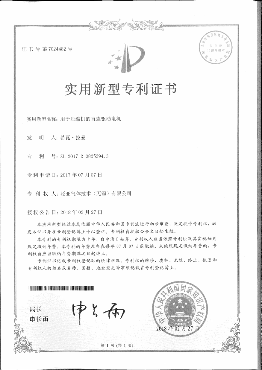 压缩机直连驱动电机专利证书